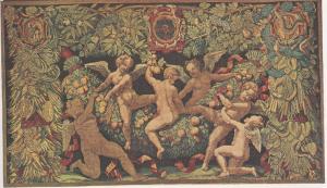 in una cornice arborea, sei putti alati giocanoa cavallo di una ghirlanda di foglie e frutta.