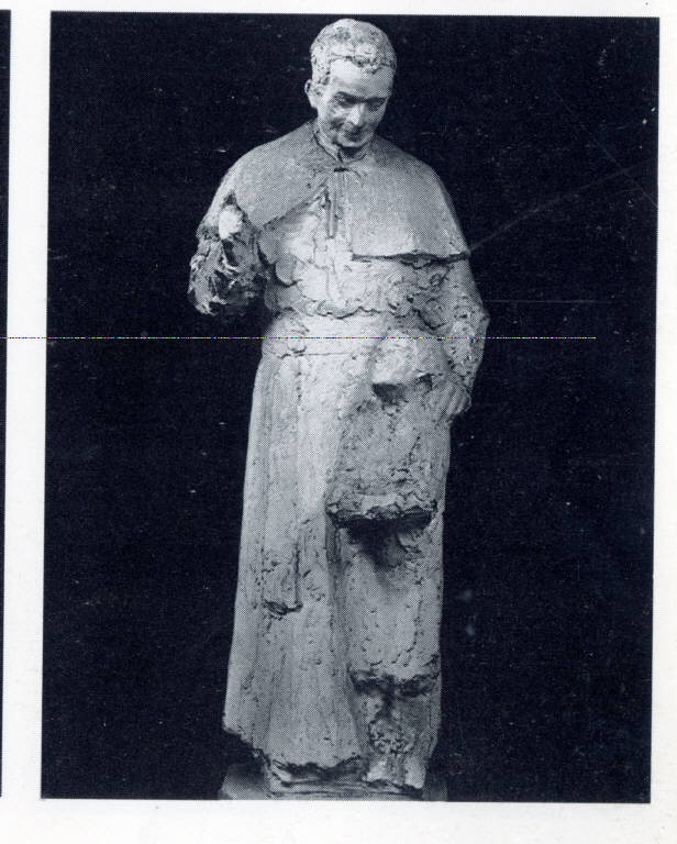 Sigura di santo salesiano con il viso rivolto verso il basso al suo fianco un bambino.