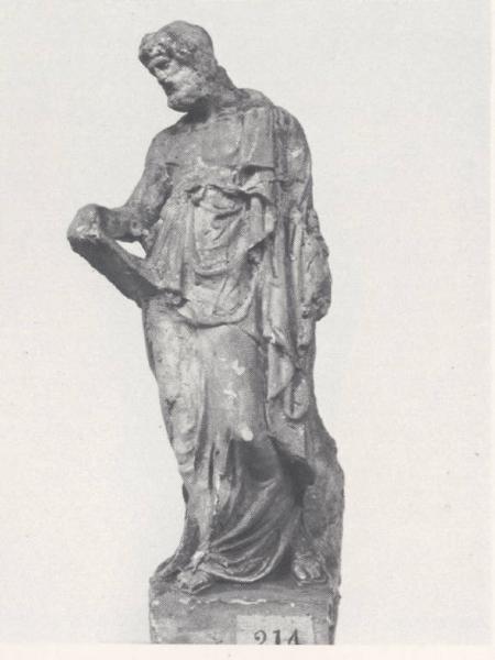 figura virile paludata, con una tavola appoggiata alla gamba sinistra.
