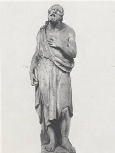 Figura virile barbuta con la mano sinistra al petto. le vesto sono lunghe fino al ginochio e lasciano scoperto metà del torace.