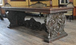Il grande tavolo ebanizzato ed intagliato è una evoluzione della tipologia del tavolo "a lira". Piano cosmposto da tre assi, profilato da cornice a palmette, fascia sottopiano interamente percorsa da motivo geometrico incavato; due sono gli elaboratissimi supporti, a guisa di motivi decorativi comprendenti scudi entro cartelle mistilinee, sormontati da mascheroni coronati da volute da cui si dipartono due panneggi. Indi, verso la sommità del tavolo: cartella con motivo di conchiglia, sormontata da cartiglio orizzontale con volute al centro del quale vi è un più piccolo mascherone. Terminali ferini: animali fantastici composti da testa di cane, corpo femminile e piedi di capra. Traversa caratterizzata da motivi a volute e panneggi; elemento centrale è un grande mascherone sormontato da grande palmetta.