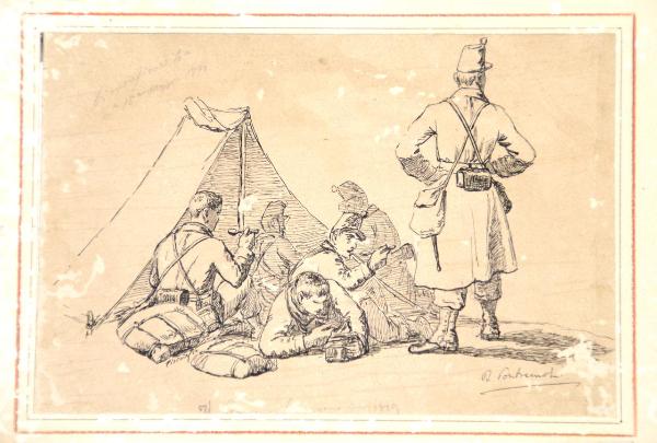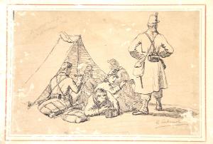 - NOTIZIE STORICO CRITICHE Si tratta di schizzi dal vero eseguiti da Pontremoli al tempo delle battaglie di Solferino e San Martino, che ritrae cinque soldati nel campo militare durante il momento del rancio.