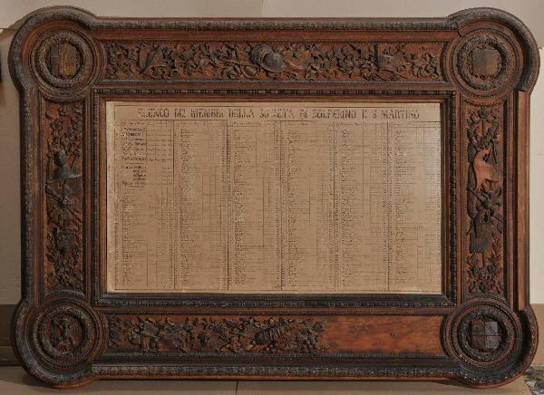 La cornice contiene documento elencante i componenti della società Solferino e San Martino. Cornice molto elaborata: profilo a doppia gola, seguito da motivo a fusello alternato a perle. L'ampia fascia è decorata con ricchi motivi di panoplie miliatri. A segnare gli angoli, quattro medaglioni tondi contengono stemmi entro corone d'alloro. Controprofilo a foglie ricorrenti .