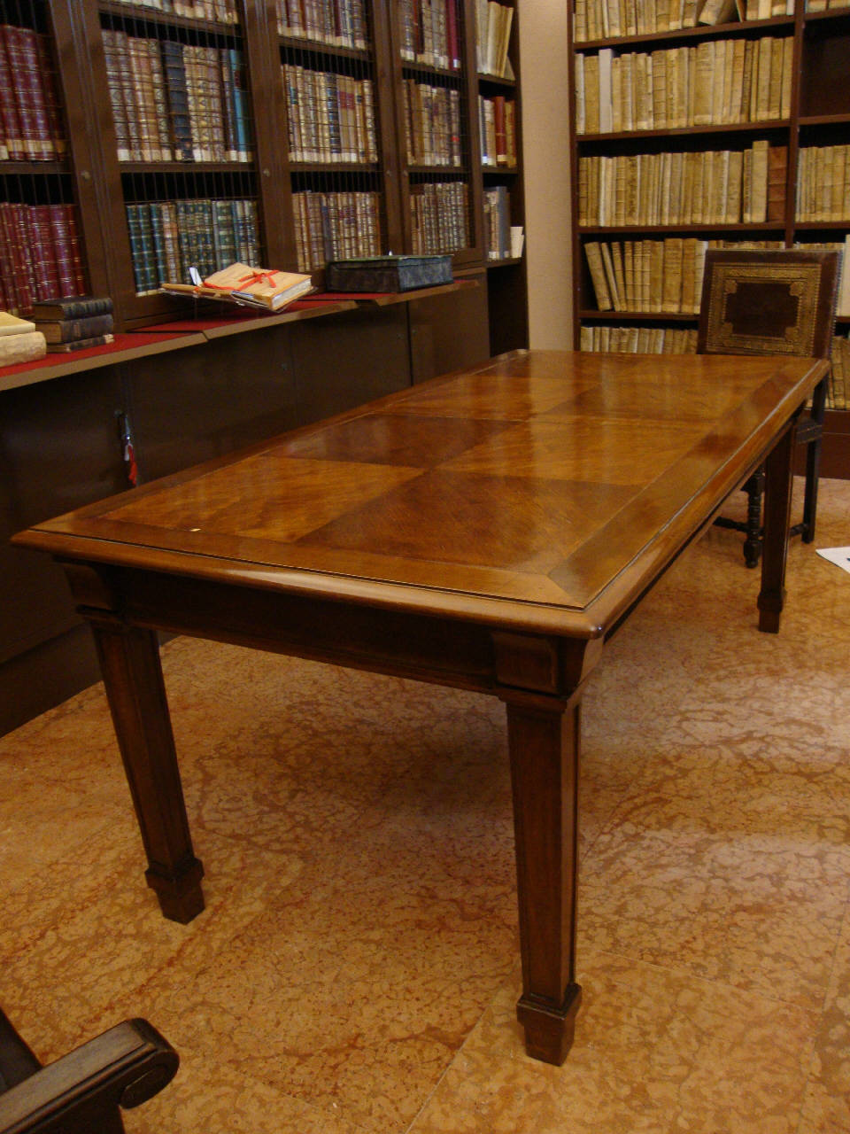 Tavolo con superficie impiallicciata a riquadri con andamento a scacchiera.