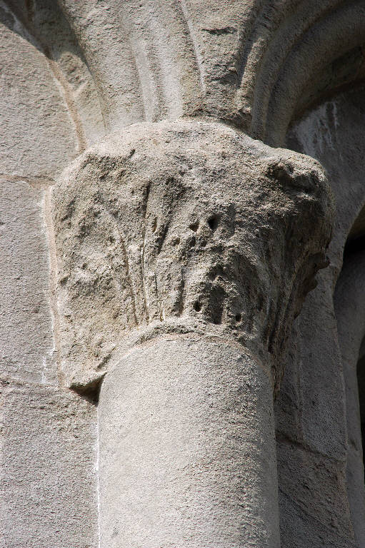 Capitello di semicolonna in pietra arenaria scolpita; motivo decorativo a foglie d'acanto.