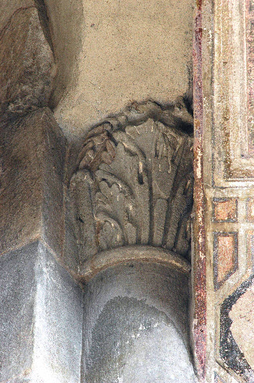 Capitello di semicolonna in pietra arenaria scolpita; motivo decorativo a foglie d'acanto.