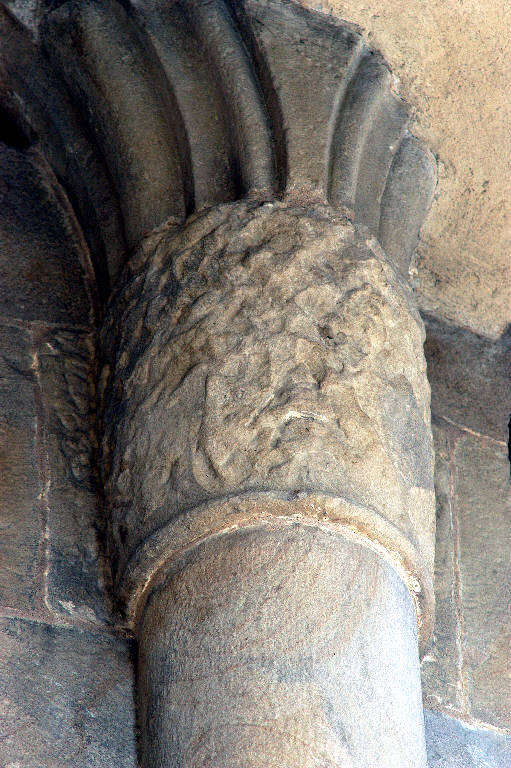 - NOTIZIE STORICO CRITICHE Il capitello, secondo la recente proposta di Francesca Buonincontri, è da assegnare alla bottega di Cristoforo, maestro di cultura antelamica che firma, se davvero così si può interpretare la scritta presente attorno al clipeo, il rilievo con la testa di Cristo posto nell'ordine inferiore dell'abside centrale della basilica (scheda NIN 132) e che, a detta della studiosa, è il responsabile, con la sua bottega, quasi dell'intera serie di capitelli romanici che orna le pareti esterne dell'edificio (Buonincontri, 2005, p. 212, cat. B. I, 4). Francesca Buonincontri ricostruisce, per via stilistica, la formazione del maestro che, dopo aver collaborato all'apparato scultoreo del Duomo di Parma, si sarebbe trasferito a Carrara, dove la sua mano è forse riconoscibile in alcuni capitelli interni e nei rilievi del portale maggiore, e infine a Bergamo, attorno al 1137, quando era da poco iniziata la costruzione della basilica; Cristoforo avrebbe chiuso la sua carriera a Milano, nel cantiere della basilica di San Simpliciano (Buonincontri, cit., pp. 53-71). A mio avviso, però, il solo appiglio del nome "Cristoforus" inciso sul rilievo dell'abside centrale è troppo vago, ed è difficile sostenere, su questa base, la ricostruzione di una intera personalità storicamente individuata: resta valida, della proposta della Buonincontri, la parte relativa all'analisi delle coordinate culturali entro cui si muove l'autore, o forse sarebbe meglio dire gli autori, del ciclo ornamentale delle absidi, viste le sensibili differenze di mano tra le varie parti; per questo motivo, preferisco assegnare il ciclo a maestri anonimi, attivi nella prima metà del XII secolo, di formazione condotta tra Lombardia ed Emilia. \nL'opera è stata restaurata nel 1978-1981 e nel 2001 (Buonincontri, cit.).