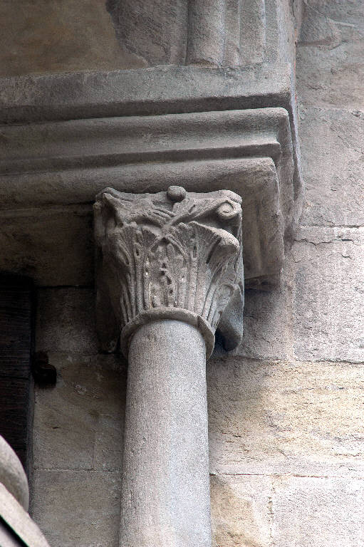 Capitello di colonna in pietra arenaria scolpita; motivo decorativo a foglie d'acanto, con ordine superiore di caulicoli fogliati; sullo spigolo interno sinistro, due uccelli, forse colombe.
