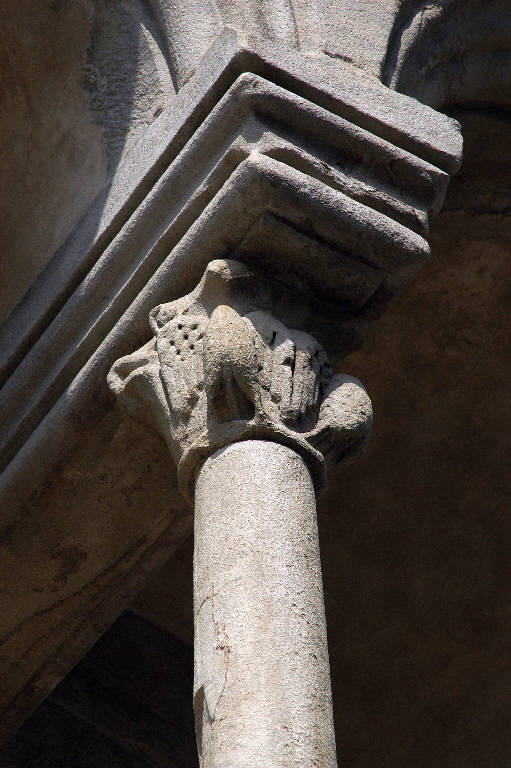 - NOTIZIE STORICO CRITICHE Il capitello, secondo la recente proposta di Francesca Buonincontri, è da assegnare alla bottega di Cristoforo, maestro di cultura antelamica che firma, se davvero così si può interpretare la scritta presente attorno al clipeo, il rilievo con la testa di Cristo posto nell'ordine inferiore dell'abside centrale della basilica (scheda NIN 132) e che, a detta della studiosa, è il responsabile, con la sua bottega, quasi dell'intera serie di capitelli romanici che orna le pareti esterne dell'edificio (Buonincontri, 2005, p. 216, cat. B. II, 3). Francesca Buonincontri ricostruisce, per via stilistica, la formazione del maestro che, dopo aver collaborato all'apparato scultoreo del Duomo di Parma, si sarebbe trasferito a Carrara, dove la sua mano è forse riconoscibile in alcuni capitelli interni e nei rilievi del portale maggiore, e infine a Bergamo, attorno al 1137, quando era da poco iniziata la costruzione della basilica; Cristoforo avrebbe chiuso la sua carriera a Milano, nel cantiere della basilica di San Simpliciano (Buonincontri, cit., pp. 53-71). A mio avviso, però, il solo appiglio del nome "Cristoforus" inciso sul rilievo dell'abside centrale è troppo vago, ed è difficile sostenere, su questa base, la ricostruzione di una intera personalità storicamente individuata: resta valida, della proposta della Buonincontri, la parte relativa all'analisi delle coordinate culturali entro cui si muove l'autore, o forse sarebbe meglio dire gli autori, del ciclo ornamentale delle absidi, viste le sensibili differenze di mano tra le varie parti; per questo motivo, preferisco assegnare il ciclo a maestri anonimi, attivi nella prima metà del XII secolo, di formazione condotta tra Lombardia ed Emilia. \nL'opera è stata restaurata nel 1978-1981 e nel 2001 (Buonincontri, cit.).
