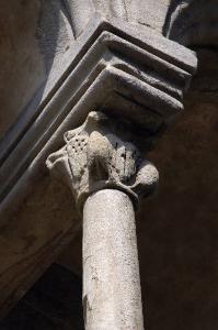 Capitello di colonna in pietra arenaria scolpita con figure di aquile ad ali aperte.