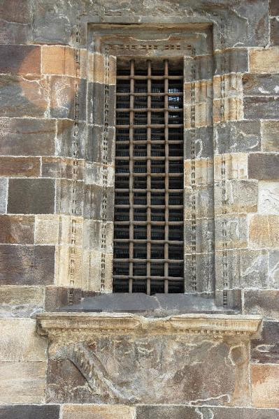 Mostra di finestra in pietra; cornice composta da una serie di cordonature alternate, modanate e scolpite a motivi decorativi a fusi e a gocce.