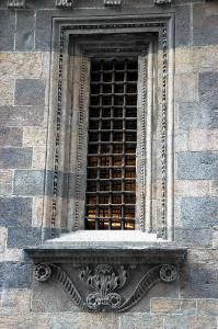 Mostra di finestra in pietra; cornice composta da una serie di cordonature alternate, modanate e scolpite a motivi decorativi a fusi e a gocce.