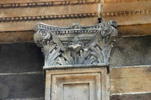 Capitello di parasta in pietra arenaria scolpita; motivi decorativi a foglie d'acanto, volute con fiori al centro e teorie di ovuli.