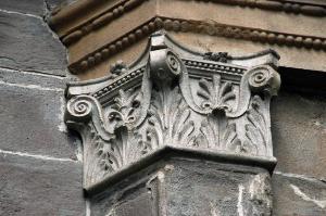 Capitello di parasta in pietra arenaria scolpita; motivi decorativi a foglie d'acanto, volute e fiori.