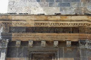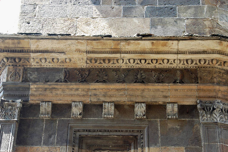 Fregio della trabeazione in pietra scolpita; motivi decorativi di foglie d'acanto, fiori e palmette.