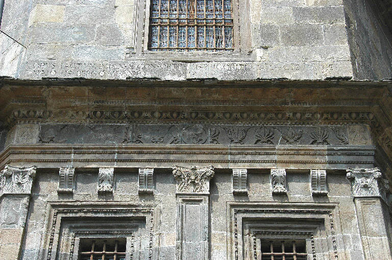 Fregio della trabeazione in pietra scolpita; motivi decorativi di foglie d'acanto e palmette; al centro, medaglione circolare con figura di Madonna con Bambino ormai quasi illeggibile.