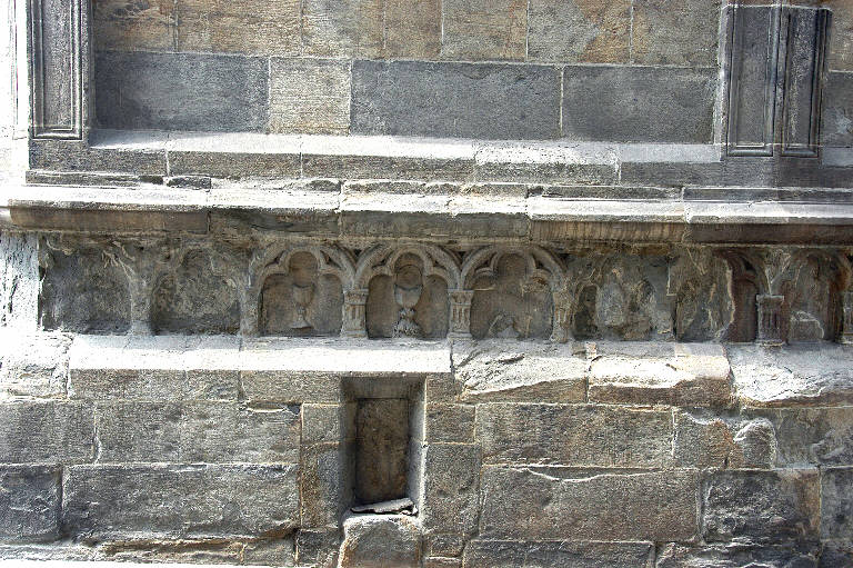 Fregio dello zoccolo in pietra arenaria scolpita con figure di calici, ostensori, croci e altri oggetti del corredo ecclesiastico.