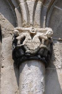 Capitello di semicolonna in pietra d'Angera scolpita; figure maschili e due coppie di draghi.