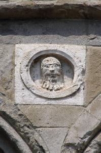 - NOTIZIE STORICO CRITICHE Il rilievo reca, tutt'intorno al clipeo, una iscrizione di non piana lettura ("CRISTOFORUS RMDC ENTE[...]LO"), che Francesca Buonincontri interpreta come la firma di un "maestro Cristoforo di Intelvi", scultore di cultura antelamica e di formazione emiliana, attivo a Parma e a Carrara; a Cristoforo, che secondo la studiosa giunse a Bergamo negli anni immediatamente successivi alla fondazione della Basilica di Santa Maria Maggiore, poco dopo il 1137, Francesca Buonincontri attribuisce l'intero apparato di decorazione scultorea d'epoca romanica dell'edificio (Buonincontri, 2005, p. 188, cat. A, 16 ).\nL'opera è stata restaurata nel 1978-1981 (Buonincontri, cit.).