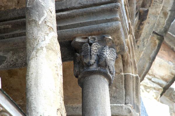 Capitello di colonna in pietra d'Angera scolpita; figure di quattro aquile erette ad ali spiegate.