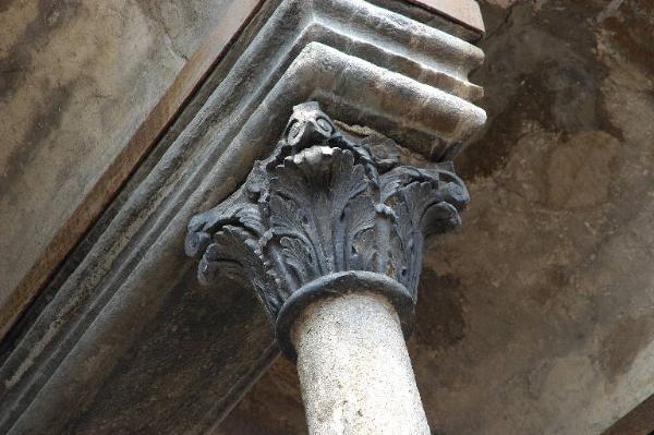 Capitello di colonna in pietra d'Angera scolpita; motivo decorativo a foglie d'acanto; al livello superiore, caulicoli fogliati.