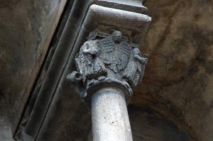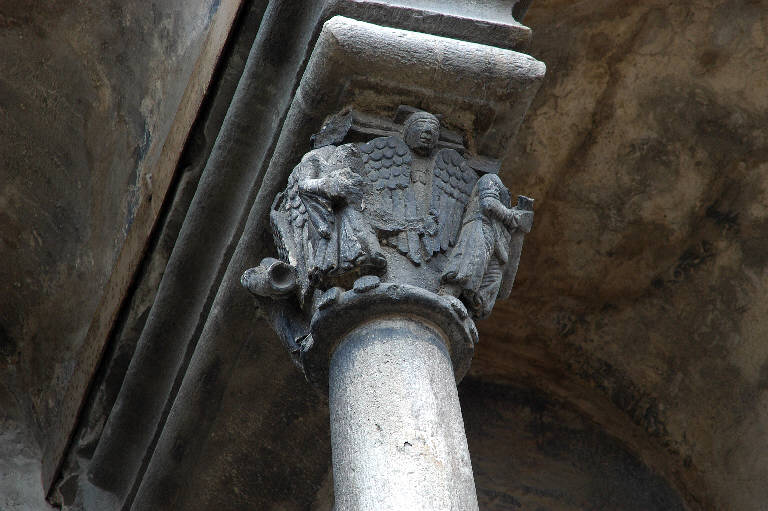 Capitello di colonna in pietra d'Angera scolpita; figure di quattro angeli ad ali aperte e busti umani nudi.