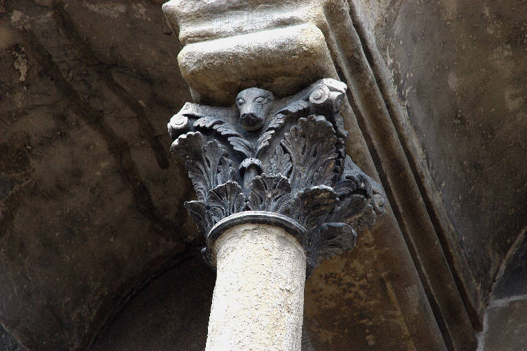 Capitello di colonna in pietra d'Angera scolpita; motivo decorativo a due ordini di foglie d'acanto; al livello superiore, caulicoli fogliati; protomi bovine sulle facce dell'abaco.