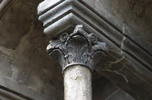 Capitello di colonna in pietra d'Angera scolpita; motivo decorativo a foglie d'acanto; al livello superiore, caulicoli fogliati; due piccole protomi leonine sulle volute angolari (spigolo interno sinistro).
