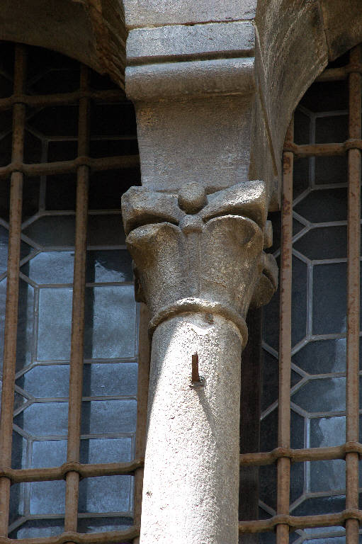 Capitello di colonna in pietra scolpita; motivo decorativo a foglie d'acqua.