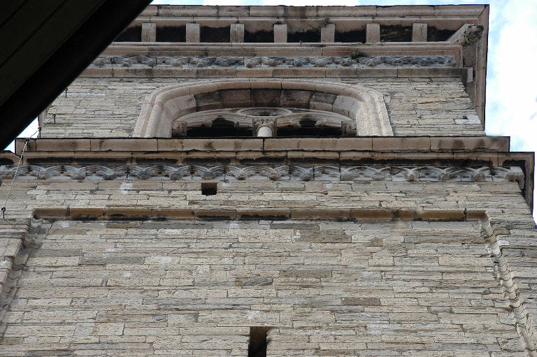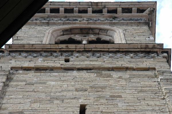 - NOTIZIE STORICO CRITICHE La costruzione del campanile ebbe inizio nel 1425, sotto la direzione dell'architetto Giovanni da Campione: i lavori, con brevi interruzioni, proseguirono fino al 1450, quando erano ormai completati i balconi della cella campanaria. L'edificio fu completato solo nel 1591, con la costruzione della cuspide in rame. Il rilievo dell'ordine mediano ad archetti trilobi e peducci decorati con testine, assai simile all'altro dell'ordine inferiore, ma meno ricco d'ornati, è stato probabilmente realizzato durante la prima fase del cantiere, tra il 1425 e il 1450 (cfr. Angelini, 1968, p. 40; Buonincontri, 2005, p. 133 e p. 225).