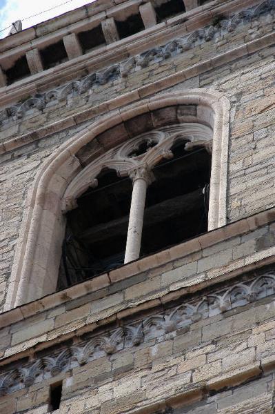 - NOTIZIE STORICO CRITICHE La costruzione del campanile ebbe inizio nel 1425, sotto la direzione dell'architetto Giovanni da Campione: i lavori, con brevi interruzioni, proseguirono fino al 1450, quando erano ormai completati i balconi della cella campanaria. L'edificio fu completato solo nel 1591, con la costruzione della cuspide in rame. La bifora, dall'elegante motivo ad archetti trilobati, è stata probabilmente realizzata durante la prima fase del cantiere, tra il 1425 e il 1450 (cfr. Angelini, 1968, p. 40; Buonincontri, 2005, p. 225).