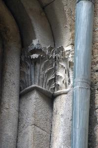 Capitello della semicolonna e della lesena in pietra d'Angera scolpita; motivo decorativo a foglie d'acanto e, al livello superiore, caulicoli fogliati.