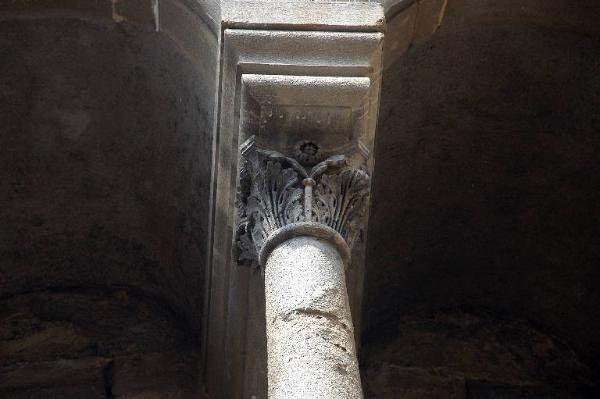 Capitello di colonna in pietra d'Angera scolpita; motivo decorativo a foglie d'acanto; al livello superiore, caulicoli fogliati con fiori e boccioli al centro.