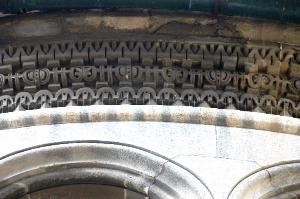Cornicione in pietra arenaria scolpita, formata da tre sequenze di motivi ornamentali: fogliette a lobo semiovale, ovoli alternati a palmette entro profili ovali, separati da due anelli e compresi tra due file di dentelli, fiori stilizzati a due petali appuntiti.