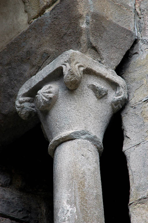 Capitello di colonna in pietra arenaria scolpita; abaco a facce piane; sotto gli spigoli, fogliette a ricciolo e, tra queste, al centro, rosette o foglie stilizzate.