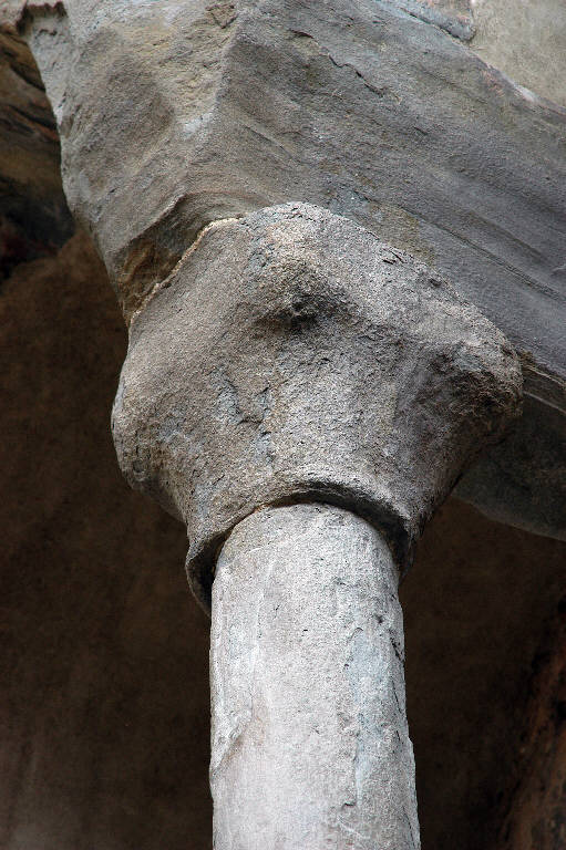 Capitello di colonna in pietra arenaria scolpita; abaco a facce piane; motivo decorativo a larghe foglie d'acqua.