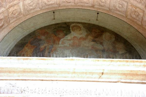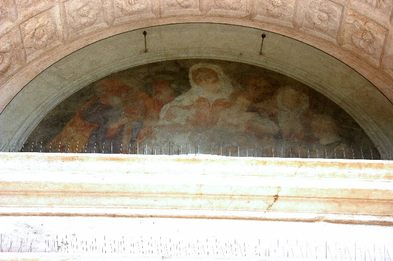 - NOTIZIE STORICO CRITICHE L'affresco è tradizionalmente attribuito ad Andrea Previtali, che l'avrebbe eseguito nel 1514: il riferimento è confermato anche dalla letteratura recente (I. Chiappini in "I pittori bergamaschi...Il Cinquecento", vol. I, p. 131, n. 20; Zanchi, 2001, p. 43), ma le condizioni attuali dell'opera, gravemente compromessa, non consentono, a mio avviso, un giudizio sicuro. \nL'affresco subì un primo restauro nel 1952: forse in questa occasione Arturo Cividini, incaricato dei lavori (cfr. documento in data 19/ 12/ 1952, prot. n. 1818, n. reg. 256, Archivio Congregazione Misericordia Maggiore, Bergamo), eseguì le operazioni di strappo, trasporto su tela e montaggio su telaio.\nNel 1990 un grave incidente danneggiò ulteriormente l'opera: nella notte del 7 marzo crollarono a terra d'improvviso il dipinto e il cristallo che era stato posto a sua protezione. Qualche anno più tardi, nel 1997,si decise quindi di procedere ad un complesso intervento di restauro che ha comportato il consolidamento del colore mediante foderatura della tela, la sostituzione del vecchio telaio, la pulitura della superficie pittorica e l'asportazione dele vecchie ridipinture e stuccature eseguite nel corso dei restauri precedenti (cfr. "Relazione finale", datata 16/ 4/ 1997, prot. 1752, cat. 5, clas. 6, fasc. 17, Archivio Congregazione della Misericordia Maggiore, Bergamo). Lo strato di fissativo, steso a conclusione del lavoro, fu poi rimosso nel 2000: si era infatti verifcato un preoccupante sollevamento della pellicola pittorica, che ha consigliato di eliminare totalmente il prodotto usato, e di non sostituirlo con altri (cfr "Relazione" in data 20/ 11/ 2000, prot. 558, cat. 5, clas. 6, fasc. 3, Arihivio Congregazione della Misericordia Maggiore, Bergamo).