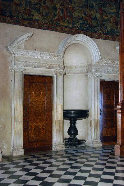 Mostra di nicchia in marmo bianco scolpito a tre aperture: la struttura è sorretta da due pilastri e da due semipilastri scanalati con capitelli d'ordine ionico; la profonda nicchia centrale, con arco a tutto centro, ospita un acquasantiera in marmo nero; le aperture laterali, architravate, incorniciano portine in radica di noce; alle due estremità, sopra l'architrave, elementi ricurvi di timpano spezzato.
