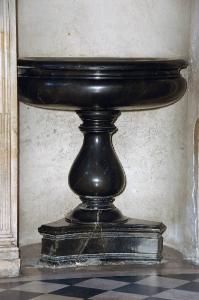 Acquasantiera in marmo nero, con base triangolare e fusto assai rigonfio alla base e assottigliato verso l'alto; vasca circolare ornata verso l'apertura da semplici modanature; elementi di raccordo modanati.
