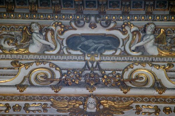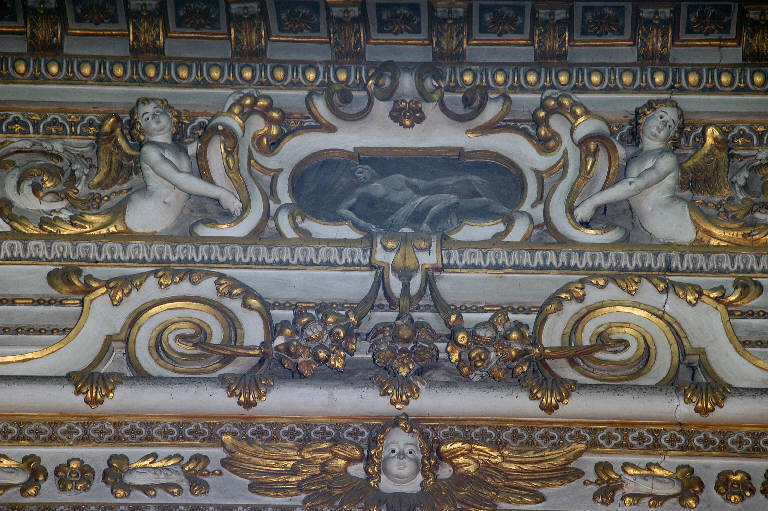 Cartiglio in stucco a volute, retto da una coppia di angioletti, che racchiude una piccola figura virile distesa dpinta a monocromo.