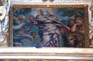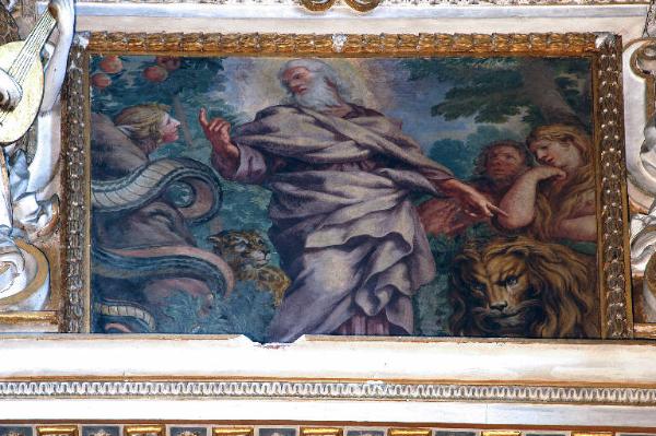 - NOTIZIE STORICO CRITICHE L'affresco, che racconta l'episodio biblico immediatamente successivo al peccato originale, la maledizione di Dio che condanna il serpente a strisciare per sempre a terra (Genesi, 3,14), fu dipinto da Ciro Ferri tra il 1666 e il 1667, insieme ad altre dodici scene tratte dall'Antico Testamento (Noris, in "I pittori bergamaschi...Il Seicento", vol. IV, p. 166, scheda 10).\nL'opera è stata restaurata nel 1960 da Franco Steffanoni (cfr. "Relazione sui lavori di restauro eseguiti ai dipinti della Basilica di Santa Maria Maggiore per incarico dell'E.C.A. di Bergamo", 24 maggio 1961, protoc. 1232, cat. 5, clas. 6, fasc. 17, Archivio Congregazione Misericordia Maggiore, Bergamo).