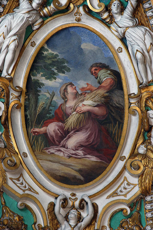 - NOTIZIE STORICO CRITICHE L'affresco, che racconta l'incontro tra Ruth e Booz nel campo di grano (Ruth, 2,1) fu dipinto da Ciro Ferri tra il 1666 e il 1667, come gli altri che ornano la volta della seconda campata (Noris, in "I pittori bergamaschi...Il Seicento", vol. IV, pp. 122-127; p. 166, scheda 10). \nL'opera è stata restaurata nel 1960 da Franco Steffanoni (cfr. "Relazione sui lavori di restauro eseguiti ai dipinti della Basilica di Santa Maria Maggiore per incarico dell'E.C.A. di Bergamo", 24 maggio 1961, protoc. 1232, cat. 5, clas. 6, fasc. 17, Archivio Congregazione Misericordia Maggiore, Bergamo).