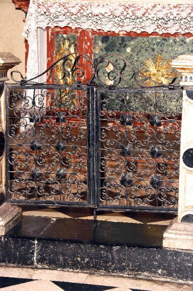 Cancello di balaustrata a due battenti: ogni battente è formato da una serie di quadrati saldati alla cornice; all'interno di ogni quadrato, motivo decorativo formato da quattro volute disposte a fiore; all'icrocio dei quadrati sono fissati elementi decorativi a quattro foglie.
