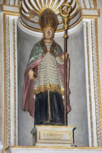 La statua è collocata, su basamento, entro una nicchia rivestita in stucco bianco e oro.