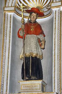 La statua è collocata, su basamento, entro una nicchia rivestita in stucco bianco e oro.