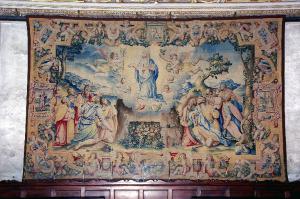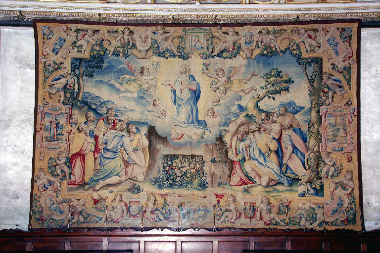 - NOTIZIE STORICO CRITICHE L'arazzo, che raffigura l'episodio della "Assunzione della Vergine", appartiene alla serie convenzionalmente detta "fiorentina", realizzata nelle Manifatture Medicee, per incarico della MIA, tra il 1583 e il 1586 e interamente dedicata alla vita della Vergine.\nNel 1580 i deputati della Misericordia Maggiore decisero infatti di provvedere la Basilica di arazzi destinati ad ornare l'edificio nelle occasioni solenni, risparmiando così le cifre ingenti che si spendevano per gli apparati effimeri: per il tramite di Girolamo Biffi, uomo d'affari bergamasco d'origine ma da anni residente a Firenze, si presero dunque contatti con il Granduca di Toscana, per ottenere i permessi necessari, e con l'Arazzeria Medicea per l'esecuzione; i cartoni furono affidati ad Alessandro Allori e alla sua bottega, la tessitura a Benedetto Squilli di Michele (Meli, 1962, pp. 24-37). Gli arazzi giunsero a Bergamo in tre consegne successive: nel 1583 la "Natività", l'"Adorazione dei Magi" e la "Fuga in Egitto", tra il 1584 e il 1585 l'"Annunciazione", lo "Sposalizio della Vergine", la "Visitazione", la "Circoncisione" e l'"Assunzione della Vergine"; infine, nel 1586, la "Presentazione della Vergine al tempio" (Meli, cit.). \nL'opera ha subito un complesso intervento di restauro tra il 2003 e il 2005, curato da Annamaria Morassutti (cfr. pratica n. 5091, cart. 97, Archivio Congregazione Misericordia Maggiore, Bergamo).