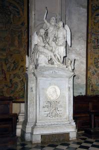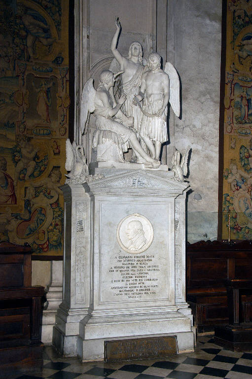 - NOTIZIE STORICO CRITICHE Simone Mayr, di origine bavarese, fu a lungo maestro nella cappella musicale della Basilica di Santa Maria Maggiore; a lui si deve l'avvio della "Pia scuola di musica", destinata ad insegnare musica e canto ai ragazzi poveri della città. Nel 1852, qualche anno dopo la sua morte, avvenuta nel 1845, la Congregazione di Carità incaricò Innocenzo Fraccaroli, che era allora scultore di buona fama, grazie anche agli ottimi studi compiuti (era stato allievo a Roma di Tenerani e Thorvaldsen), di scolpire il monumento funebre dedicato a Mayr; l'epigrafe fu ideata dal conte Pietro Moroni (Zanchi, 2003, p. 388).