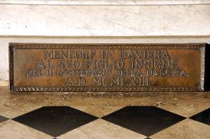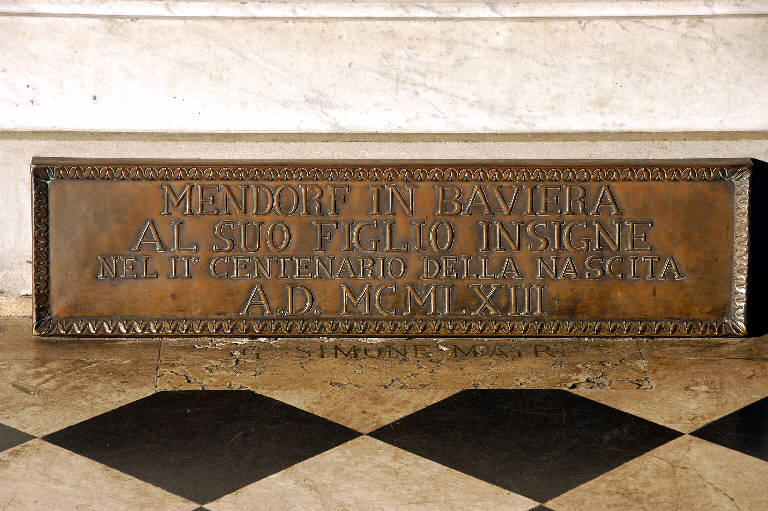 Lastra in lamina di rame con cornice a semplici motivi decorativi; iscrizione commemorativa a sbalzo.
