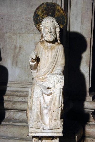 - NOTIZIE STORICO CRITICHE La statua era un tempo collocata in una delle aperture dell'edicola della guglia, realizzata tra il 1400 e il 1403 dallo scultore tedesco Hans von Fernach ("Anex de Alemania"), a lungo attivo nel cantiere del Duomo di Millano (cfr. C. Baroni "La scultura gotica lombarda", Milano 1944, p. 132 e p. 147, nota 10; S. Angelini, 1968, p. 60); fu sostituita da una copia probabilmente durante i restauri del 1975-76 (direzione arch. Sandro Angelini), che hanno coinvolto l'intera area del protiro meridionale. La datazione di questa e delle altre sculture che provengono dalla guglia è assai discussa: la letteratura critica più recente sostiene che non si tratta di pezzi scolpiti da Hans von Fernach, ma di opere realizzate nella bottega di Giovanni da Campione e in seguito assemblate dallo scultore tedesco nella grande impresa della guglia (Lomartire, 2009, p. 74). \nLa statua è stata sottoposte ad un intervento di pulitura nel 2001 (si veda la relazione sullo stato di conservazione delle statue, prot. 1721, cat. 5, clas. 7, fasc. 1, Archivio Congregazione della Misericordia Maggiore,Bergamo).