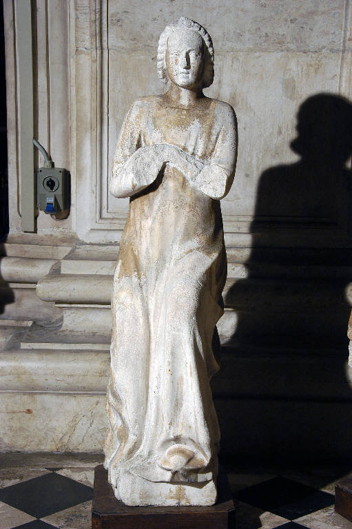 - NOTIZIE STORICO CRITICHE La statua era un tempo collocata in una delle aperture dell'edicola della guglia, realizzata tra il 1400 e il 1403 dallo scultore tedesco Hans von Fernach ("Anex de Alemania"), a lungo attivo nel cantiere del Duomo di Millano (cfr. C. Baroni "La scultura gotica lombarda", Milano 1944, p. 132 e p. 147, nota 10; S. Angelini, 1968, p. 60); fu sostituita da una copia probabilmente durante i restauri del 1975-76 (direzione arch. Sandro Angelini), che hanno coinvolto l'intera area del protiro meridionale. La datazione di questa e delle altre sculture che provengono dalla guglia è assai discussa: la letteratura critica più recente sostiene che non si tratta di pezzi scolpiti da Hans von Fernach, ma di opere realizzate nella bottega di Giovanni da Campione e in seguito assemblate dallo scultore tedesco nella grande impresa della guglia (Lomartire, 2009, p. 74). \nLa statua è stata sottoposte ad un intervento di pulitura nel 2001(si veda la relazione sullo stato di conservazione delle statue, prot. 1721, cat. 5, clas. 7, fasc. 1, Archivio Congregazione della Misericordia Maggiore,Bergamo).